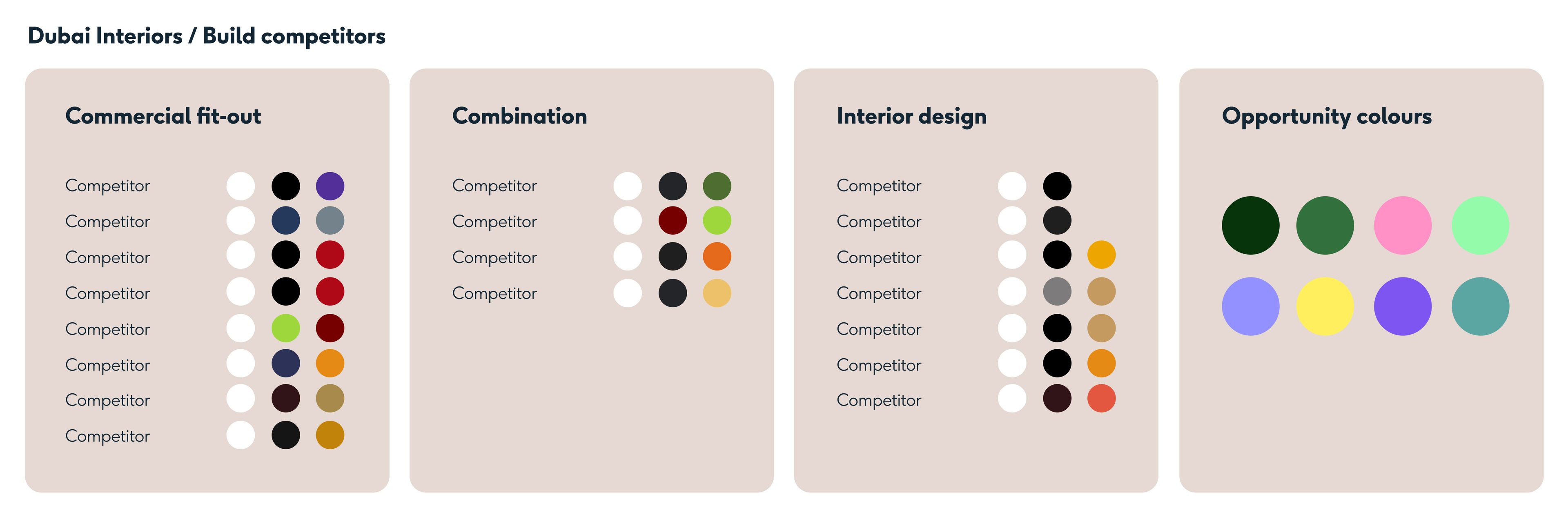 Break away from the competition: A deep dive into your competitors’ colour schemes can show you the gaps. If everyone’s banking on blue for trust, an electric orange could make you look like the innovator. One of our clients in Dubai, designfit, got our full competitor breakdown which led us to find the perfect opportunity colours to make them shine in their market.